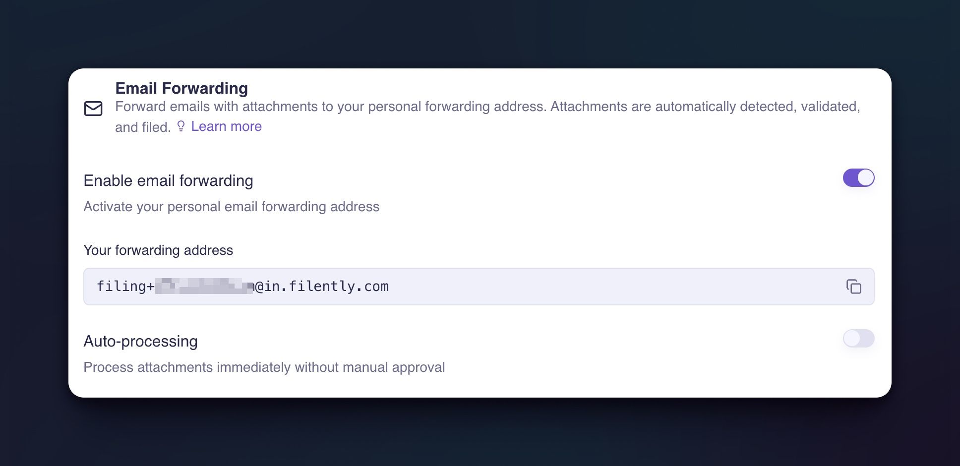 Copy your unique email address, formatted like filing+yourtoken@in.filently.com.