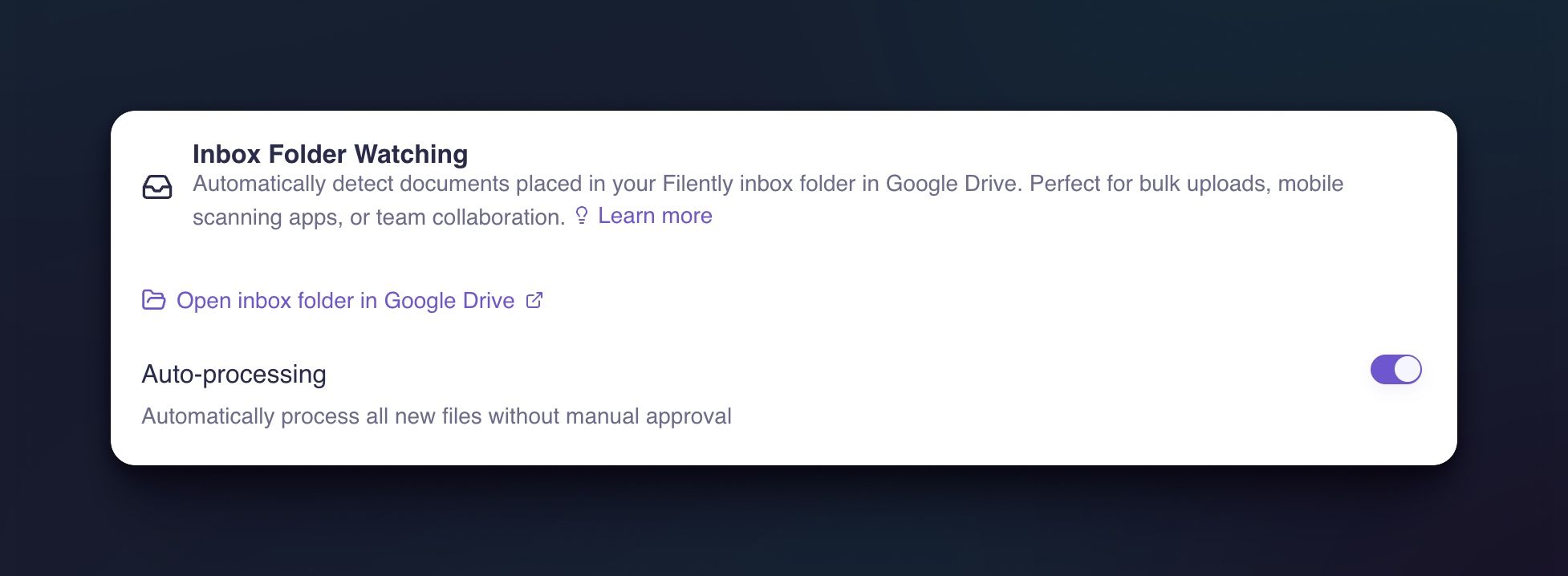 Filently creates a designated Inbox folder in your Google Drive where you can effortlessly add documents.
